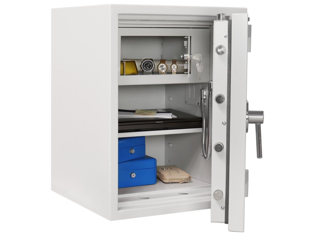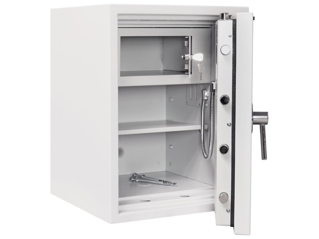 Hlavní výhody: Certifikovaný elektronický zámek Bezpečnostní třída II (ČSN EN 1143-1) Ohnivzdornost po dobu 30 minut pro papír Možnost úschovy i zbraní a střeliva podle č.190 / 2003 Sb. z. Napájení 1 x 9V baterií (není součástí balení) Příprava pro EMA 3-stranný uzamykací mechanizmus Vnitřní schránka Nastavitelná polička uvnitř Otevření dveří až do 180 ° Možnost doobjednání teleskopické zásuvky Možnost doobjednání teleskopické poličky Možnost doobjednání teleskopické registratury Elektronické nouzové otevírání externí baterií Otvory na ukotvení na spodní straně trezoru Šedý nábytkový ohnivzdorný trezor z modelové řady Diamant Fire Premium disponuje certifikovaným elektronickým zámkem a bezpečnostní třídou II (ČSN EN 1143-1). Ochrání uložené papírové dokumenty i před působením ohně a to až po dobu 30 minut. Zámek je napájen klasickou 9V baterií a výhodou je příprava pro EMA. Kromě cenností, šperků, cestovních dokladů a šanonů můžete v trezoru uložit i krátké zbraně a munici. Uvnitř se kromě poličky nachází i samostatně uzamykatelná vnitřní schránka. Bezproblémový přístup k uloženým věcem umožní trezorové dveře, které lze otevřít až do úhlu 180°. Na spodní straně jsou připraveny otvory pro ukotvení. Kotvící materiál je součástí balení. Kování zámku zvyšuje celkovou vnější hloubku trezoru o 60 mm.Doplňkové parametry